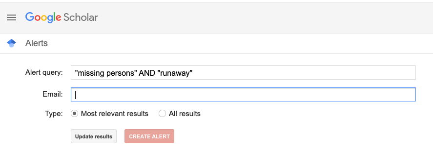 You can also search for more than one phrase at the same time like this: “missing persons” AND “runaway”.