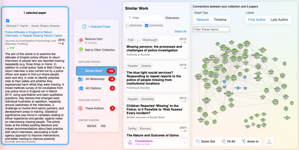 A relatively new alternative to Google Scholar is Research Rabbit which is a bit like Spotify but for academic research papers. After finding a research paper that is relevant to what you’re looking for, you can click a button to find all similar research papers or all research by the same authors. Research Rabbit can also send you email alerts when it finds new research that it thinks is relevant to what you’re looking for but these email alerts may be more relevant than alerts that Google Scholar sometimes sends as it uses artificial intelligence. It also displays a visualisation of how all the research links together so that you can see which research papers have been referenced the most and which authors have done research on similar topics: